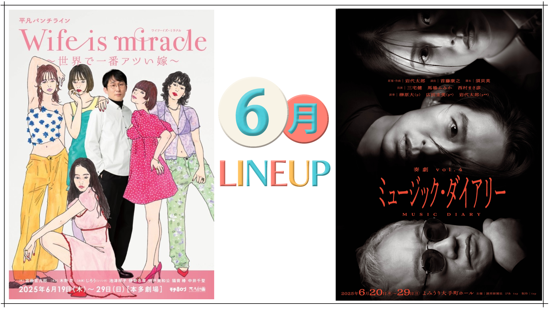 6月には、宮藤官九郎作、シソンヌじろう主演による平凡パンチライン「Wife is miracle~世界で一番アツい嫁」(下北沢)、三宅健、馬場ふみか、西村まさ彦、3名の役者と2台のピアノによる音楽交換日記の物語、奏劇vol.4「ミュージック・ダイアリー」(大手町)など、関東近郊で開催される多様なジャンルの舞台公演が予定されています。