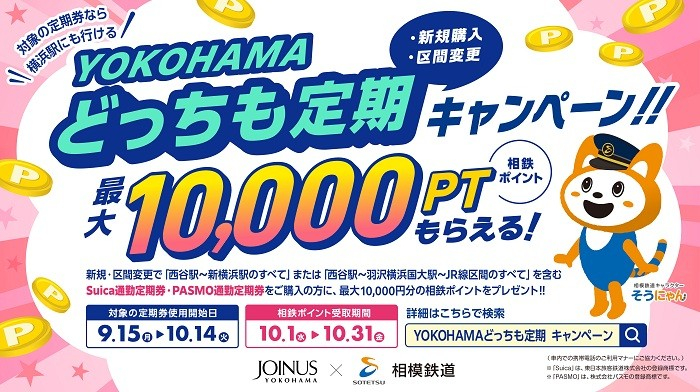 相鉄グループの相模鉄道㈱(本社・横浜市西区、社長・千原広司)と㈱相鉄ビルマネジメント(本社・横浜市西区、社長・左藤 誠)は、2025年9月15日(月・祝)から「YOKOHAMAどっちも定期 新規購入・区間変更キャンペーン」(以下、同キャンペーン)を実施します。
