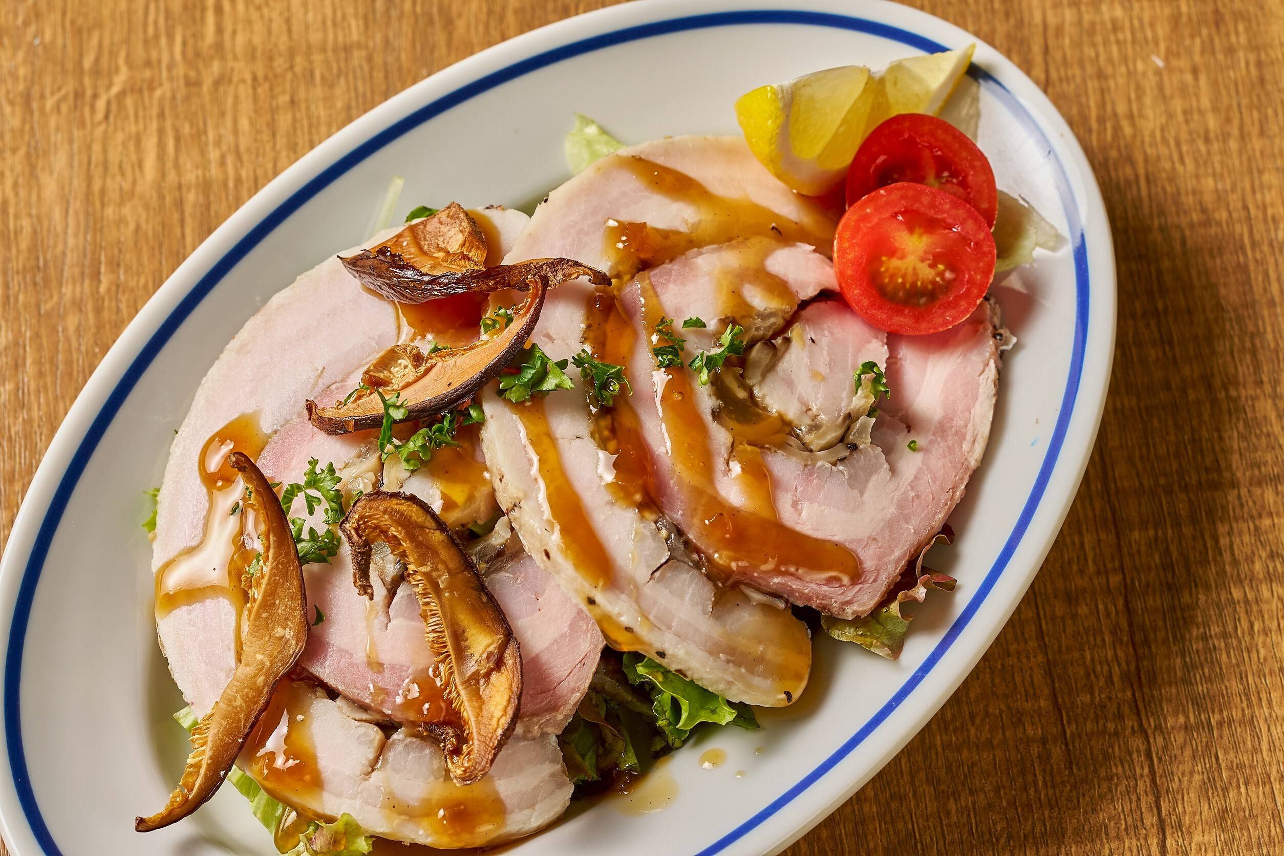 シャルキュトリーとは、フランスの伝統的な食肉加工品のことです。地元、伊豆産のしいたけとロールハムをサラダと一緒にお召しあがりいただけます!