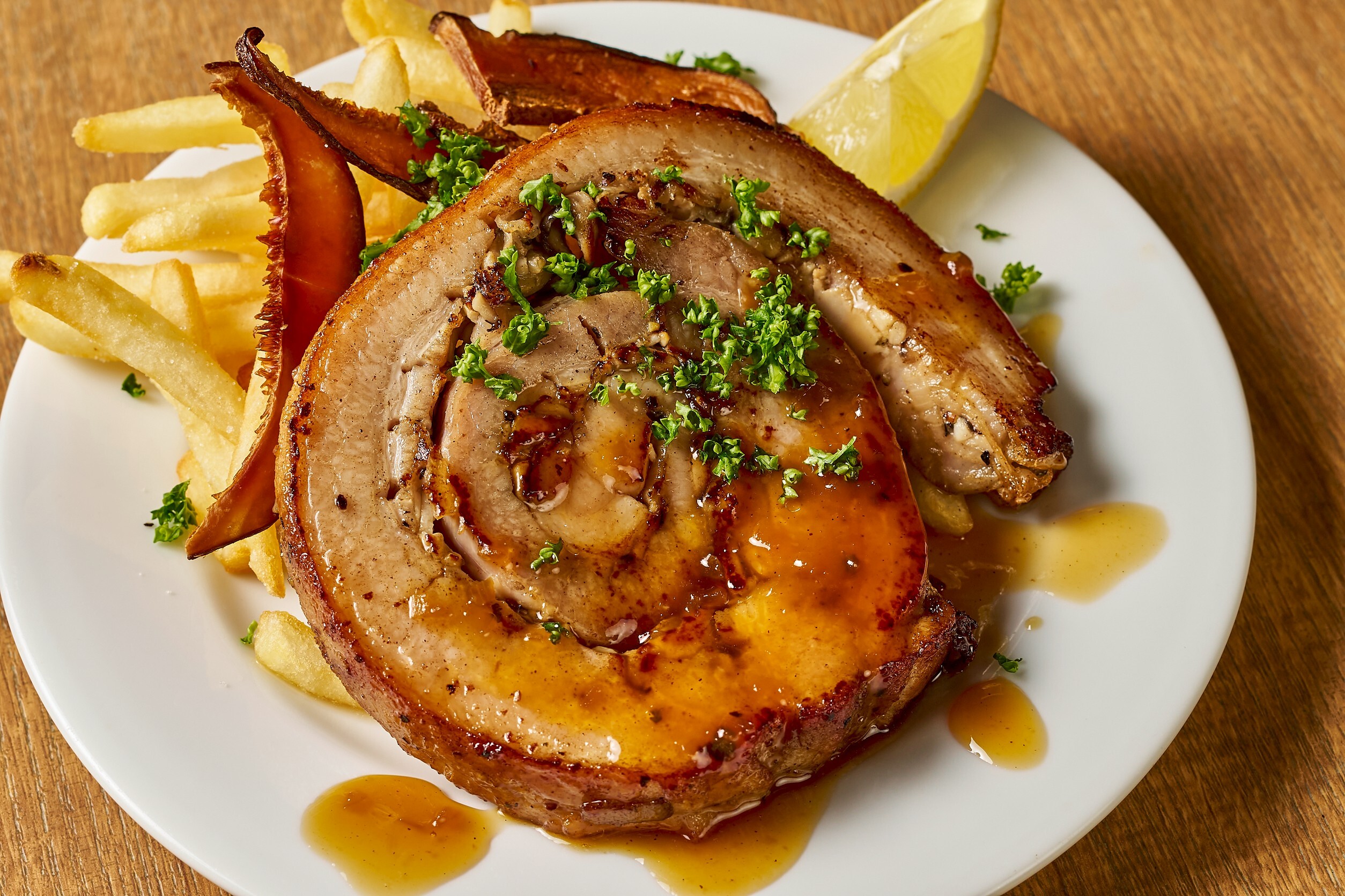 ポルケッタとは、イタリアが誇る伝統的なローストポークの一種です。地元、伊豆産のしいたけの旨みを、香ばしいポルケッタで包み込み、仕上げにトリュフソースの芳醇な香りをまとわせました。パセリの彩りと、レモンの爽やかな酸味がアクセント!伊豆の恵みと上品な香りを、秋の味覚としてお楽しみください!
