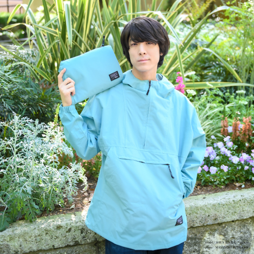 アウトドアシーンで便利なアノラックタイプのレインジャケット。フード廻りにアジャスターコード付で、フロントポケットへ収納するポケッタブル仕様になっています。止水ファスナーを採用されており、縫い目にはシームテープを施しているので、浸水も軽減される仕様になっています。