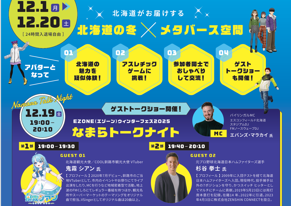 本イベントは、2025年12月1日(月)〜12月20日(土)の20日間開催され、北海道の冬の魅力をメタバース空間で体験することができます。