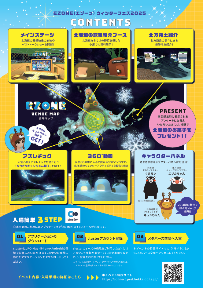 国内最大級のメタバースプラットフォーム「cluster」を運営するクラスター株式会社(本社:東京都品川区、代表取締役CEO:加藤直人)は、株式会社メガ・コミュニケーションズ(本社:北海道札幌市、代表取締役:柴田 史郎)と協力し、北海道が主催するメタバースイベント『EZONE(エゾーン)ウィンターフェス2025』の空間制作と運営を行うことをお知らせいたします。
