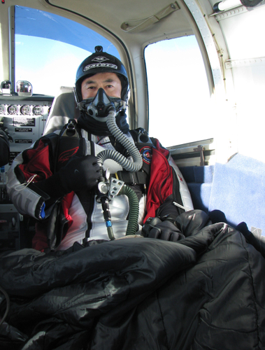 ギネスに挑戦する時は、高度1万メートルから飛ぶので酸素は地上の1/3、気温はマイナス50度。ちょうどジェット旅客機が飛んでいる高さです。急激に高度が上がると、血液中の窒素が泡になって脳や体の血管を詰まらせる恐れがあるので、事前に減圧室に入って、万が一低酸素症にかかっても体が動くか確認します。当日も離陸前に純酸素を1時間吸って、血液中から窒素を抜きます。また、事前に航空自衛隊で訓練を受け、低酸素症についても体験してきました。飛行機に乗ってからも、与圧されていないプロペラ機の限界とされる高度1万メートルに達するまでに約60分。極寒の機内で寝袋にくるまって待機し、上空まで達したら特殊な酸素ボンベと酸素マスクを装着して、空へ飛び立つ。滑空時間は約7〜8分。そんな危険で過酷な状況でも、記録に挑戦して、限界を超えていくのが楽しくて仕方がないですね。