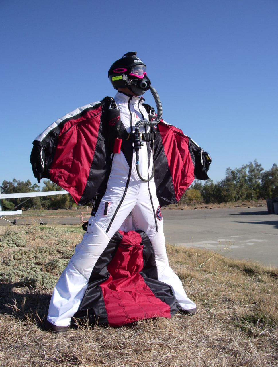 1990年代中頃、フランス人スカイダイバーによって考案された手と足の間に布を張った滑空飛行を可能にした特殊ジャンプスーツ(通称ムササビスーツとも呼ばれる)。 1999年にフィンランドのBIRDMAN社から世界初の市販ウイングスーツが発売され、究極のスカイスポーツとして世界中に普及していく。スカイダイビングのように飛行機やヘリコプターにより上空からや、高い崖からの “BASEジャンピング” により飛び降り自由自在に滑空する。マントを広げて翼をつくり空気抵抗を増やすだけでなく、スーツの中に空気を取り込んで揚力も発生するようになっている。最新のウイングスーツは、飛行機などの実験で使われるエアートンネルで試験し、コンピューターで解析・デザインされており、対地落下速度は50~100km/h、水平平均飛行速度は最大250km/h以上で飛行することが可能。通常のスカイダイビングに較べて、スーツから受ける身体の制約が多くなるため、飛行機からのエグジット方法・空中での姿勢・パラシュートオープン時の姿勢と方法・オープン後の処理・緊急時の対処方法が異なり、トレーニングが必要とされます。