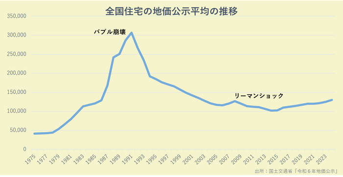 不動産の価値は市況により変化します。過去の例でいえば、1990年代初頭のバブル崩壊や2008年のリーマンショックの際に見られたような地価の下落など、不動産市況は生き物のように変化し続けています。