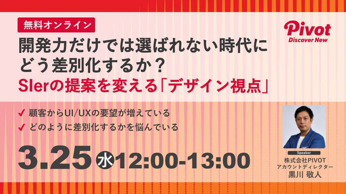 株式会社PIVOT(URL:https://pivot.jp/、本社:東京都、代表取締役社長:宮嵜 泰成)は、2026年3月25日(水)12時より、無料オンラインセミナー「開発力だけでは選ばれない時代にどう差別化するか? ―― SIerの提案を変える『デザイン視点』」を開催します。