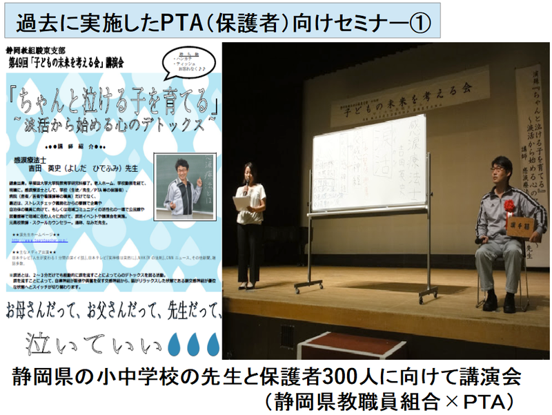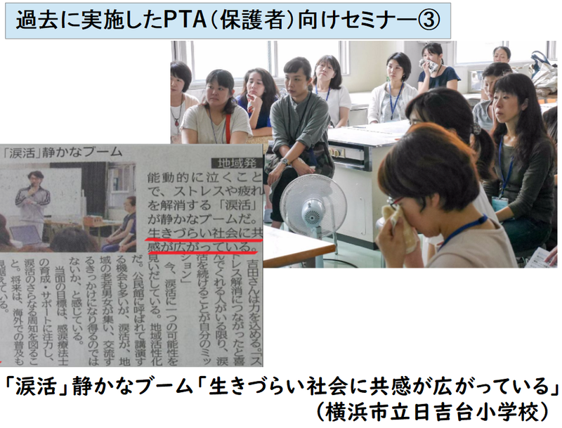 葛飾区立渋江小学校で育児で疲れてストレスをためている保護者を対象に感動の涙でストレス解消させる、「なみだ先生」こと感涙療法士の吉田英史が「涙活(るいかつ)」講演を1月13日(葛飾教育の日)に実施します。