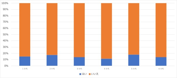 上の質問では、語学レベルについて「初心者レベル」と答える人が多いことがわかりましたが、その言語を習得するために英会話スクールなどに通ったことのある人は、かなり少ないようです。英会話スクールなどの語学教室の利用経験について尋ねたところ、通ったことが「ない」と答えた人は約85%でした。この回答についてはどの年代も共通した傾向がみられ、「習得したいけれどスクールは通わない」人が多いことがわかります。