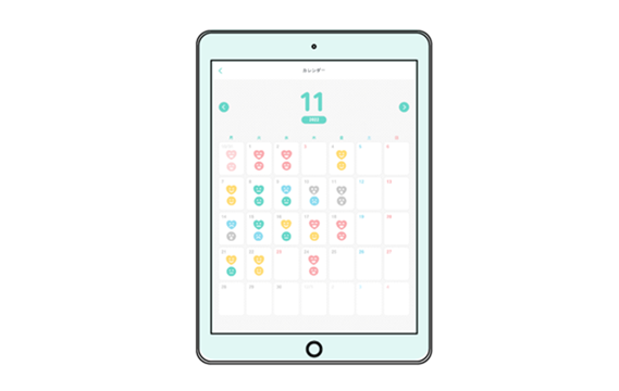 アプリ内の「気分・体調のアンケート」機能で子どもの気分や体調を見える化できます。結果はカレンダー形式で記録され、子ども自身での振り返りが可能となり、自己認知のきっかけとなることが期待されます。