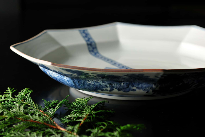 「器は着物」と唱えた美食家「北大路魯山人」の教えにならい、蟹を盛り付ける大皿は、地元の九谷焼作家の方々に特注しています。例えば、山本長左氏に依頼した皿は、ダイナミックな蟹料理が引き立つよう、表面は敢えてシンプルにし、蟹をしめ縄で結わえることにちなんだ「結」を表すデザインがほどこされています。皿の胴には、繊細な模様がびっしりと描きこまれ、側面から見たときの料理と器のマリアージュもポイントです。