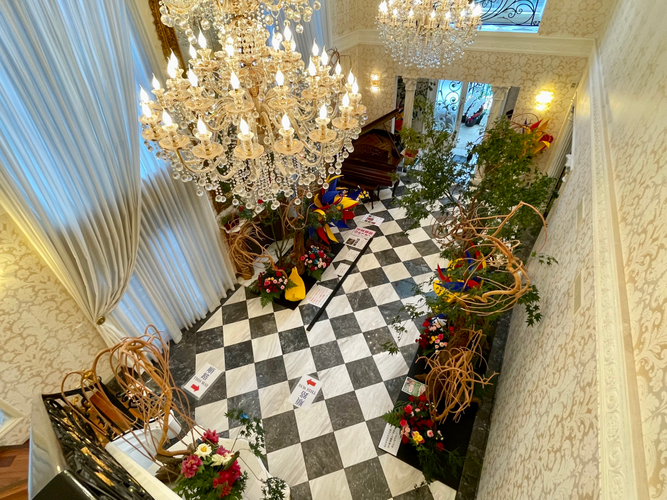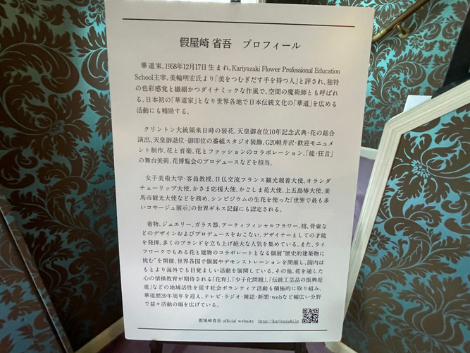 本展覧会は、今まで一般公開していなかった假屋崎省吾氏自身が全てデザインした私邸(東京:表参道)を花教室生徒との競演で豪華絢爛に彩ります。ヨーロピアンテイストの建物と華道歴40周年を目前にした天才華道家の作品との美しいコラボレーションをお楽しみください。