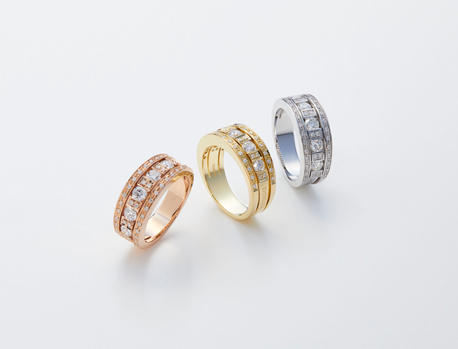 今回のエキシビジョン開催を記念して、ダミアーニ 日本橋三越本店では、「ベル エポック」リングの復刻モデルを先行発売いたします。 イタリアンジュエリーらしい幅の太いデザインは、ホワイトゴールド素材のみの取り扱いでしたが、このたびピンクゴールドとイエローゴールドが再び発売になります。