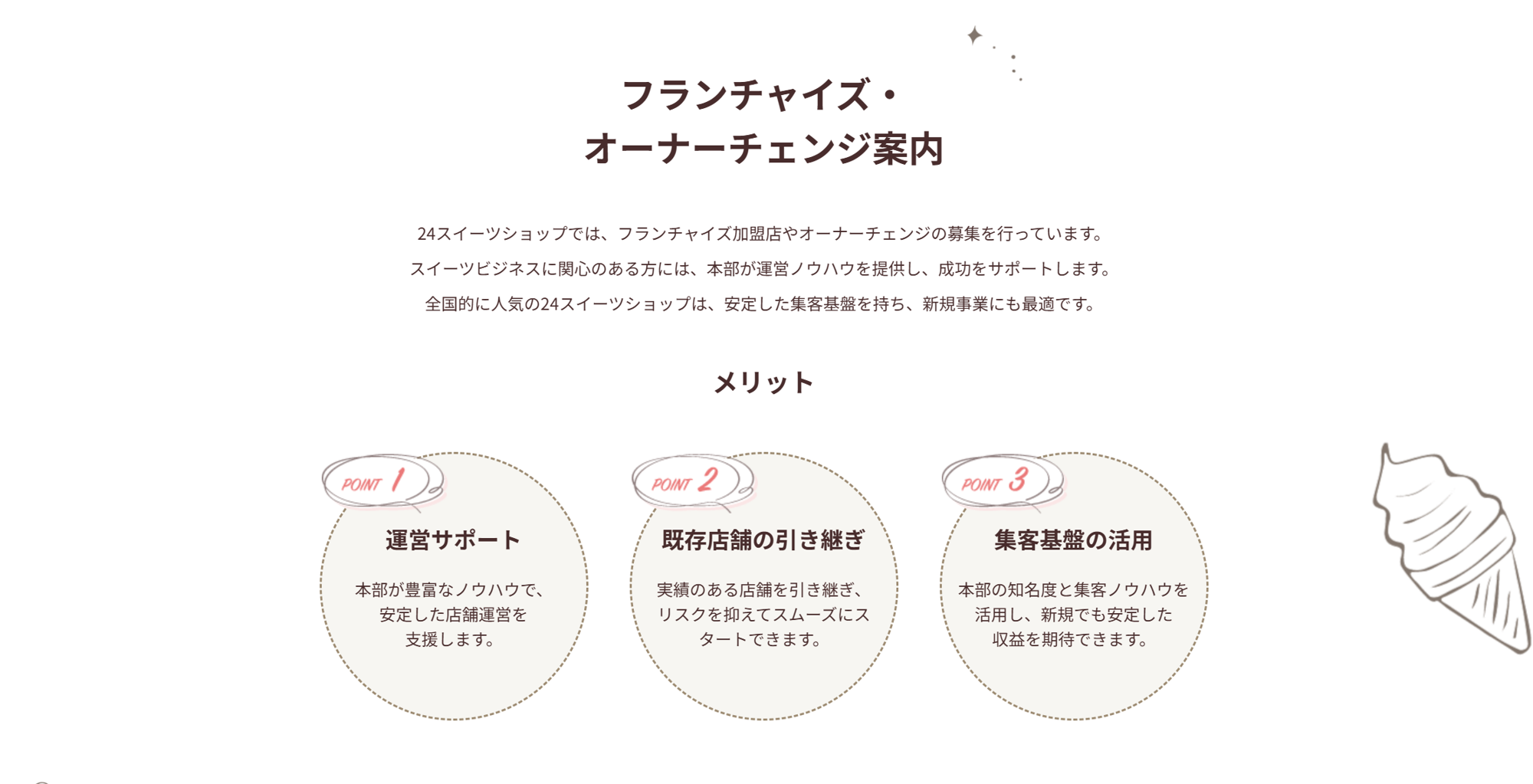 「24スイーツショップ」では、全国展開を進めるなかで、フランチャイズ加盟店および既存店舗のオーナーチェンジ希望者を募集しています。