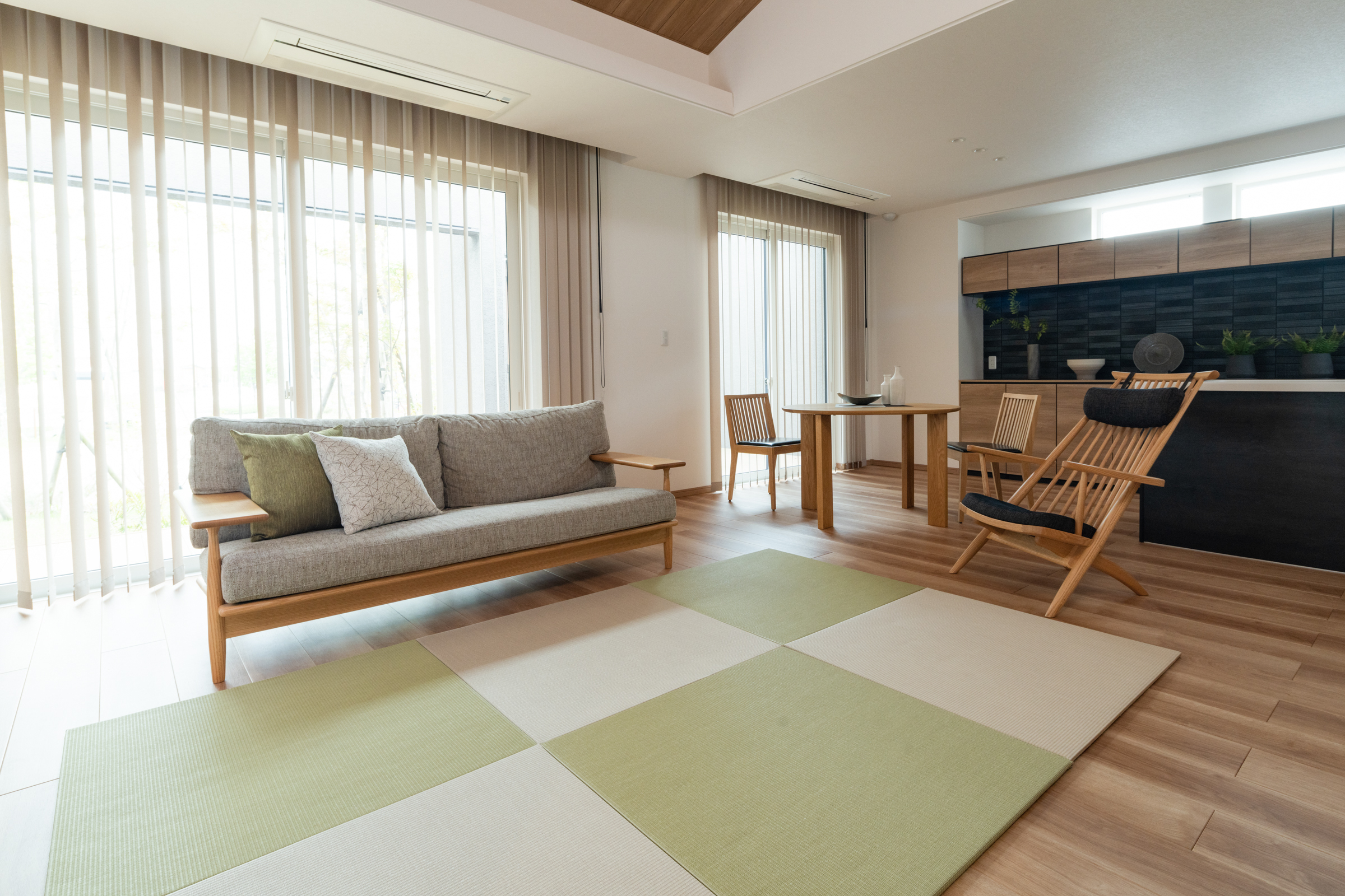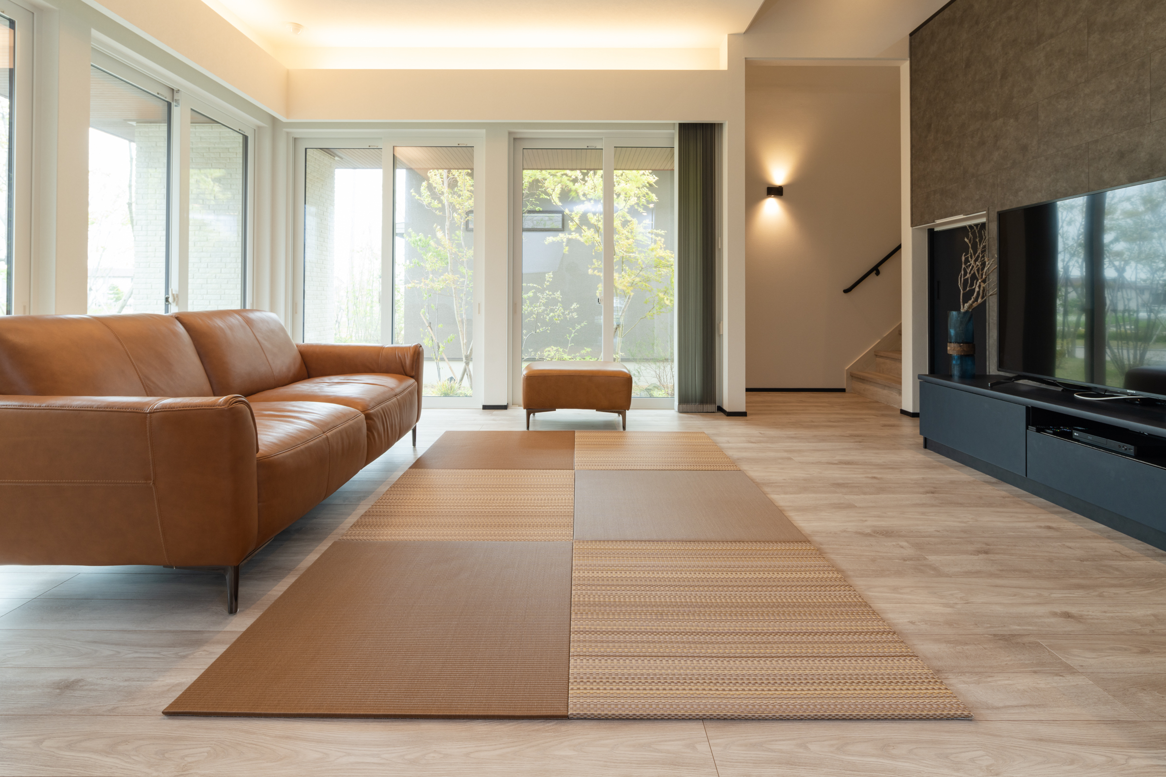 床暖房にも対応しているため、フローリングで足下の冷たいリビングや子供部屋の足ざわりを、やさしくやわらかく温かい空間に変えることができ、夏場だけに限らず寒い冬も快適に過ごせる空間を提供します。デザイン性に優れているため、日本伝統の住宅はもちもん、デザイン住宅にも映える「新感覚」の置き畳です。