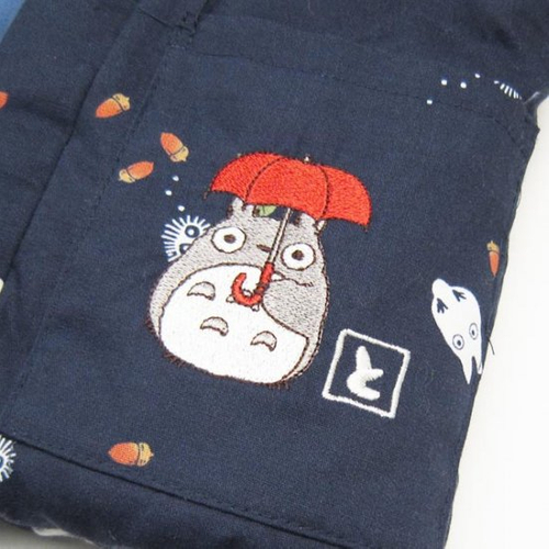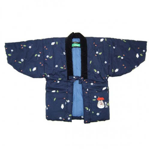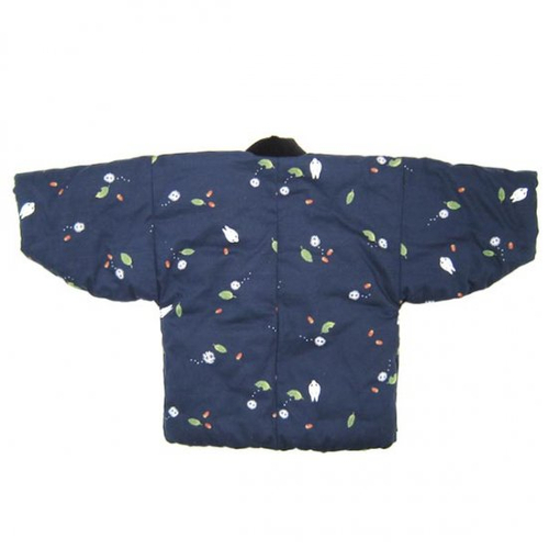 ネイビーの半纏には、舞い上がる木の葉と一緒に空を飛ぶ小トトロとまっくろくろすけの姿が。