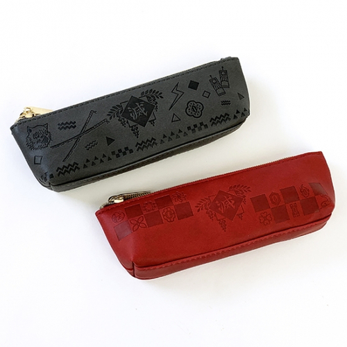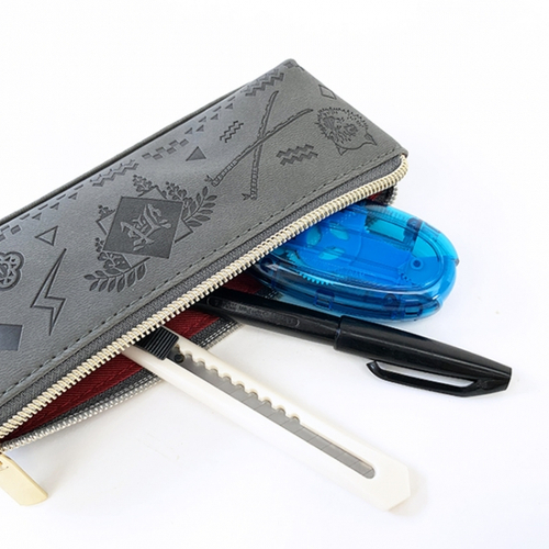 3つ目は、こちらの黒のレザー風ペンケースです。ポーチと同様のデザインがプリントされていますね。サイズは、6×18.5×3.5㎝です。ペンケースにしては少し小さ目ではありますが、その分持ち運びがしやすいですよ。