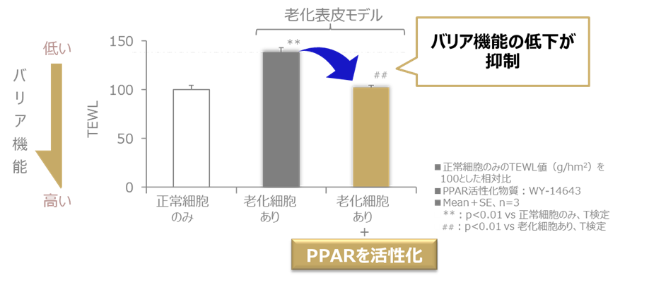 正常な表皮細胞の一部に老化細胞を混ぜて、実験的に培養表皮を作製し(老化表皮モデル)、PPARの活性化による作用を検討しました。PPARの活性化により、老化細胞が引き起こす表面状態の荒れや表皮構造の乱れが抑制され(図2)、老化細胞によるバリア機能の低下も抑えられました(図3)。さらに、老化表皮モデルの内部で認められた老化マーカーの発現も、PPARの活性化により抑制されることが明らかとなりました(図4)。