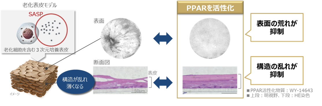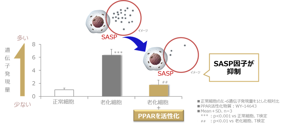 細胞の老化は、マイトリガーゼの減少によるミトコンドリア機能異常などの要因で進行します。さらに、老化細胞は周囲に悪影響を与える物質を放出し(SASP)、これが正常な細胞の老化を誘発することで、老化は加速度的に進んでしまうと考えられます。肌においても、加齢に伴い老化細胞が蓄積することが確認されています。しかし、当社の研究により、細胞内に存在する受容体PPARを活性化させることで、SASPが抑制され、老化細胞が引き起こすさまざまな変化を抑制できることが明らかとなりました。本知見は、肌の老化を根本から制御し、いつまでも若々しい肌を実現するための新たなアプローチとして期待が持たれます。