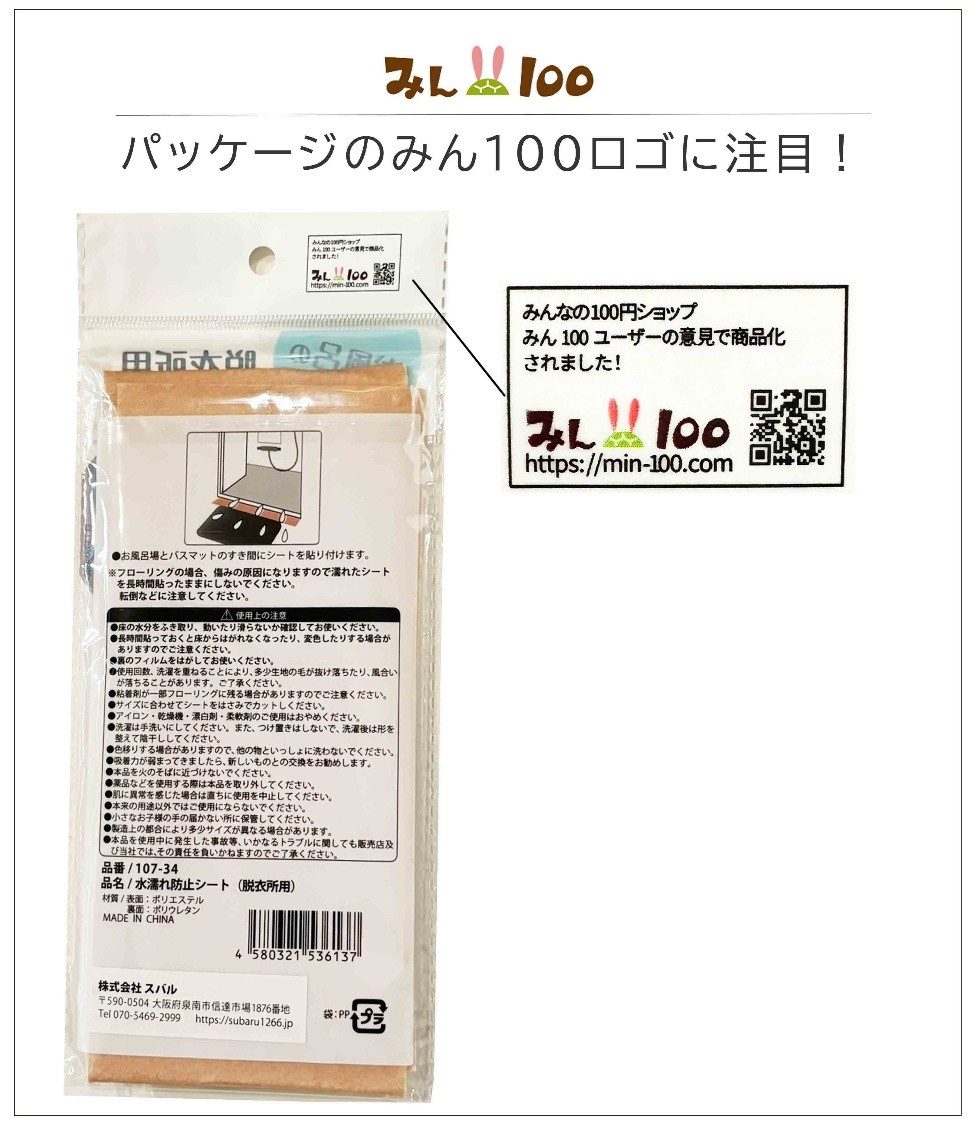 みん100株式会社(本社:京都府京都市、代表取締役:池田 大介)は、「入浴後に浴室前へ水が垂れることで床が濡れたり、バスマット周りの掃除が増えたりする」という消費者さまから頂いた課題をベースに新商品「水濡れ防止シート(脱衣所用)」を株式会社スバルと共同開発し全国の100円ショップにて販売開始いたしました。本商品は、浴室入口とバスマットのすき間に設置することで水滴の広がりを防止し、脱衣所の床を快適に保つことを目的に開発されたものです。