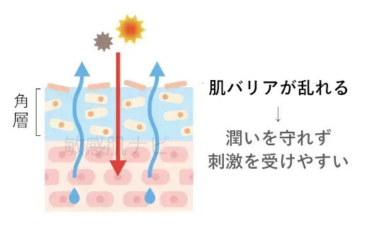 神経線維が伸びると、普段は気にならない刺激にも強く反応するようになり、ピリピリ感や赤みを生じやすくなります。バリアビタミンCは、神経線維の伸長を促す「炎症性物質」「神経成長因子」の物質の増加を抑えることが出来ます。