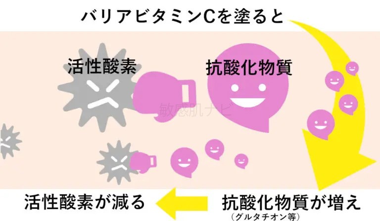- バリアビタミンC化粧品で刺激を感じなかった理由も、バリアビタミンCが低刺激だから、という理由以外にも他の成分の効果の可能性もあります。