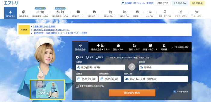 ■総合旅行プラットフォーム「エアトリ」(https://www.airtrip.jp/)
