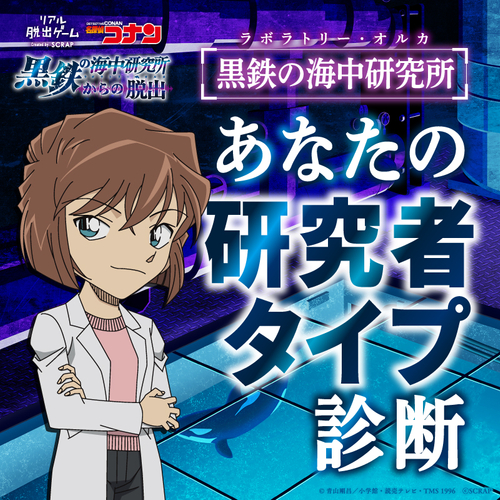 株式会社SCRAP(本社:東京都渋谷区 代表:加藤隆生)は、人気テレビアニメ「名探偵コナン」とコラボレーションしたリアル脱出ゲームの最新作『黒鉄の海中研究所(ラボラトリー・オルカ)からの脱出』の開催を記念して、Webの無料診断コンテンツ「あなたの研究者タイプ診断」を公開いたします。