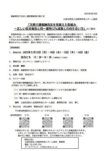 公益社団法人全国有料老人ホーム協会(理事長:中澤 俊勝、所在地:東京都千代田区/以下「有老協」)では、高齢者向け住まいの適正な運営に向けて、セミナーを実施しています。