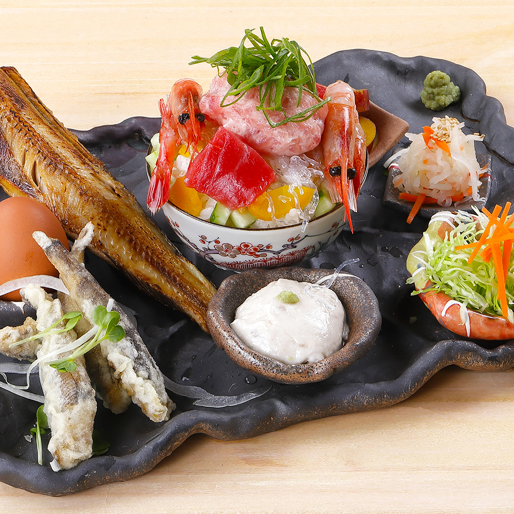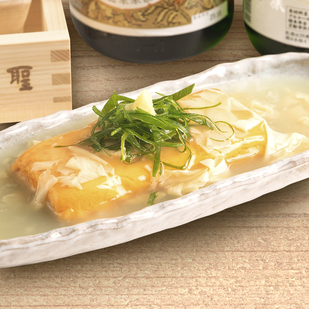 看板メニューは、蔵の直売所でしか販売されていない「神聖」の酒粕と湯葉、豆乳をふんだんに使用することでとろみのある出汁に仕上げた、寒い冬にピッタリの「神聖酒粕 京湯葉鍋」(1,639円)です。酒粕は肌荒れや肥満抑制に効果があるとされる「レジスタントプロテイン」を、湯葉はたんぱく質を多く含むため、おいしく美容にもアプローチできる女性にもおすすめのメニューです。チーズをのせて焼き上げた「京湯葉ピザ」(869円)や「京湯葉とチーズの包揚げ」(869円)などの湯葉メニュー、「酒粕フォンダンショコラ」(759円)「酒粕ブリュレ」(649円)など酒粕スイーツもご用意。このほか、「生マグロといくらの太巻き天ぷら」(1,309円)や「焼き白ネギ 金山寺味噌添え」(759円)、「手羽先唐揚げ柚子胡椒添え」(649円)など30種類以上のフードをそろえています。