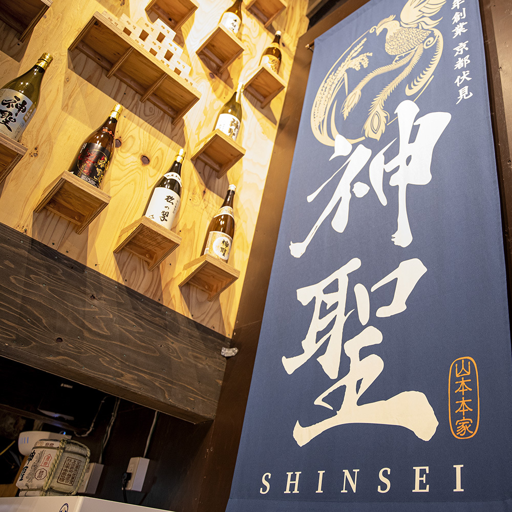 日本酒「神聖」は、京都府産の酒米「祝(いわい)」と京都酵母「京の恋」を使った「神聖 祝 純米吟醸」(869円)や軽やかな飲み口の「純米 かぐや姫」(759円)など13種類をフルラインナップ。サワーやソフトドリンクも各種そろえています。