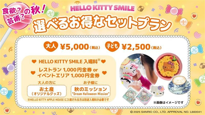 内容:「HELLO KITTY SMILE」の入場券とレストランまたはイベントエリアでご利用いただける1,000円分の金券に加え、大人の方はHELLO KITTY SMILEオリジナル商品2種類を、お子さまには期間限定デザインのアクリルコースターがもらえるウォークラリーイベント『DREAM HALLOWEEN MISSION』イベントがセットになったプラン