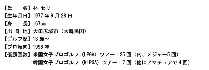 朴 セリさんは、米国女子プロゴルフ(LPGA)ツアーメジャー大会史上最年少記録などメジャー大会5勝を含む25勝、韓国LPGAツアー7勝を飾り、2007年にLPGA部門の世界ゴルフ殿堂入りを果たしているゴルフ界のレジェンドです。韓国では「LPGAのパイオニア」、「韓国ゴルフの伝説」などと称賛されております。