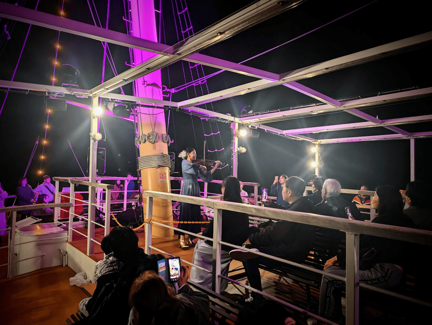プロヴァイオリニスト益子侑の船上生演奏をご用意。美しい音色と夜空の花火が織りなす、この上なくロマンチックなひとときです。
