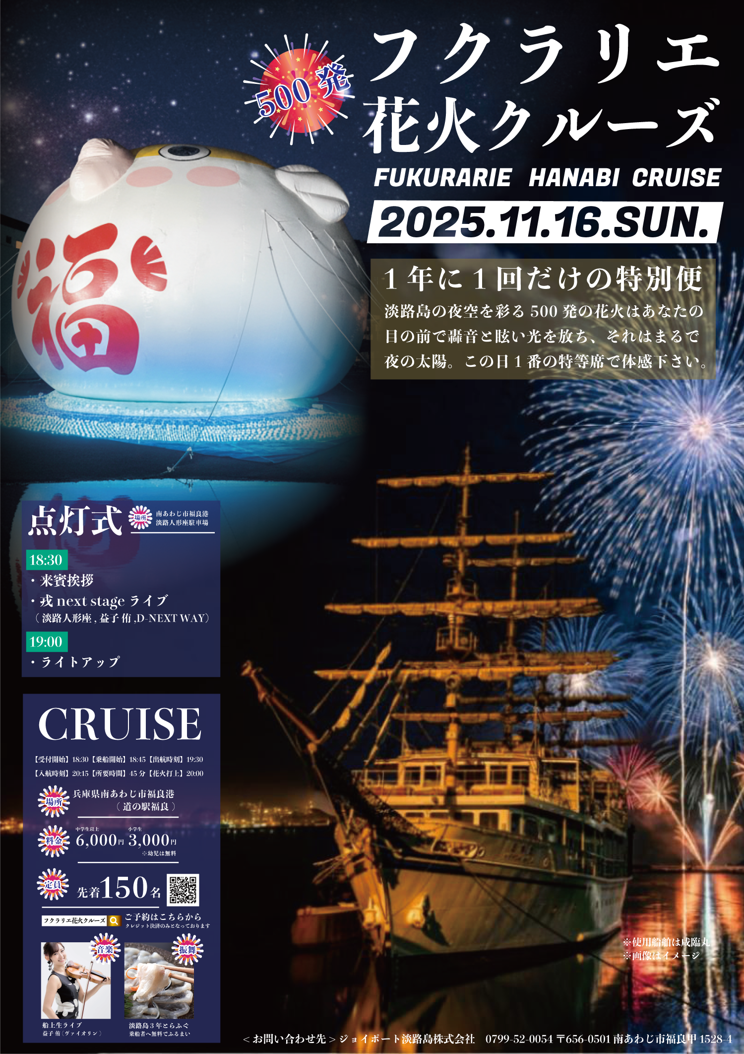 兵庫県・淡路島から出航している「うずしおクルーズ」を運営するジョイポート淡路島株式会社(本社:兵庫県南あわじ市福良、代表取締役:鎌田 勝義)は、2025年11月16日(日)から開催される「フクラリエ2025」に合わせて、船上から花火を"体感"する「フクラリエ花火クルーズ」を開催いたします。