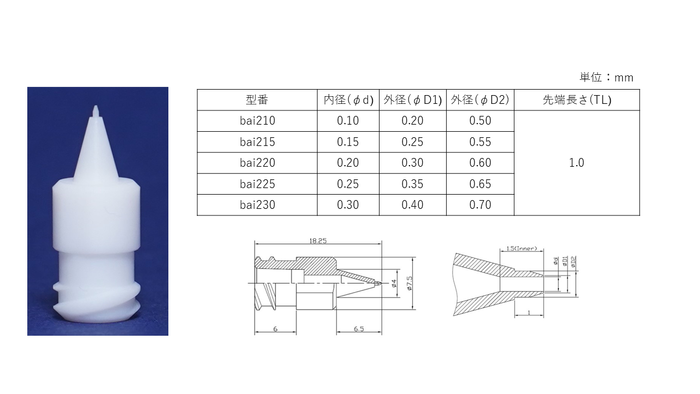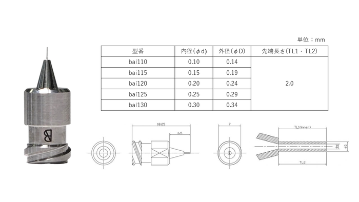 SUS303材使用。最小外径0.14mm・先端長さ2mmの極細設計で、狭小部への微細塗布に特化した精密ノズル。ノズル内外径差0.04mmの超薄肉加工技術で、高集積化が進む半導体や、カメラモジュールのピンポイント塗布に最適。高粘度材料やフィラー入り材料などにも対応でき、微細塗布を実現。