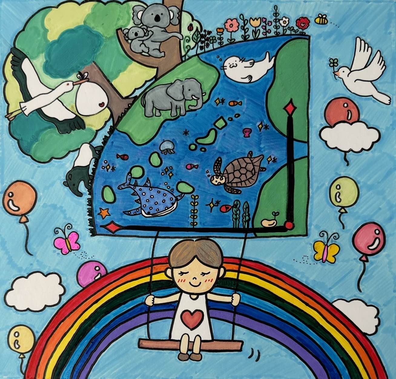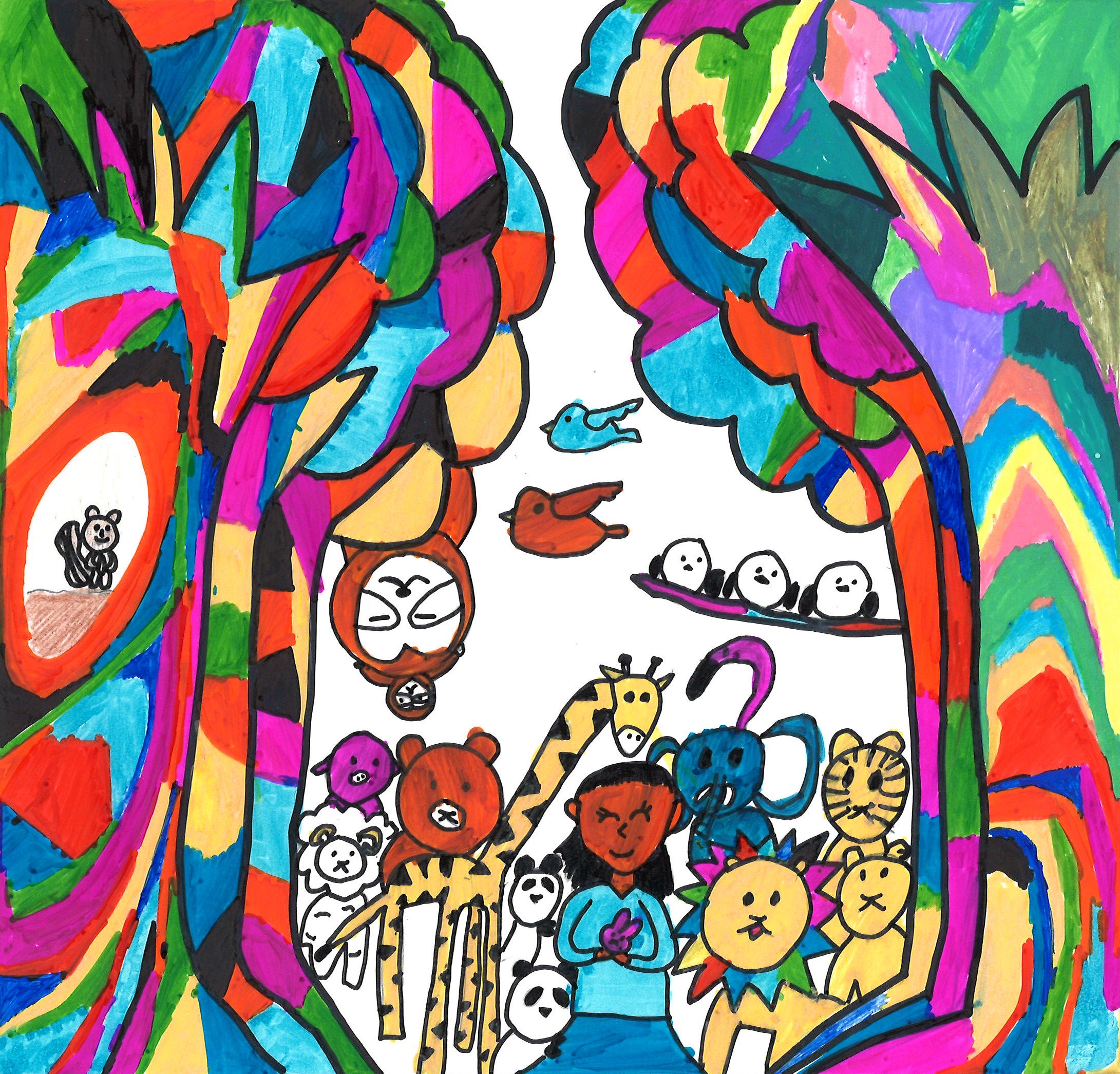 子どもの部に関しては、個性豊かな色で描かれた森にテーマの“キラキラ”が活きている。大人の部は動物も含めて全部が笑顔。笑顔溢れる環境をみんなで作っていきたいと思いました。