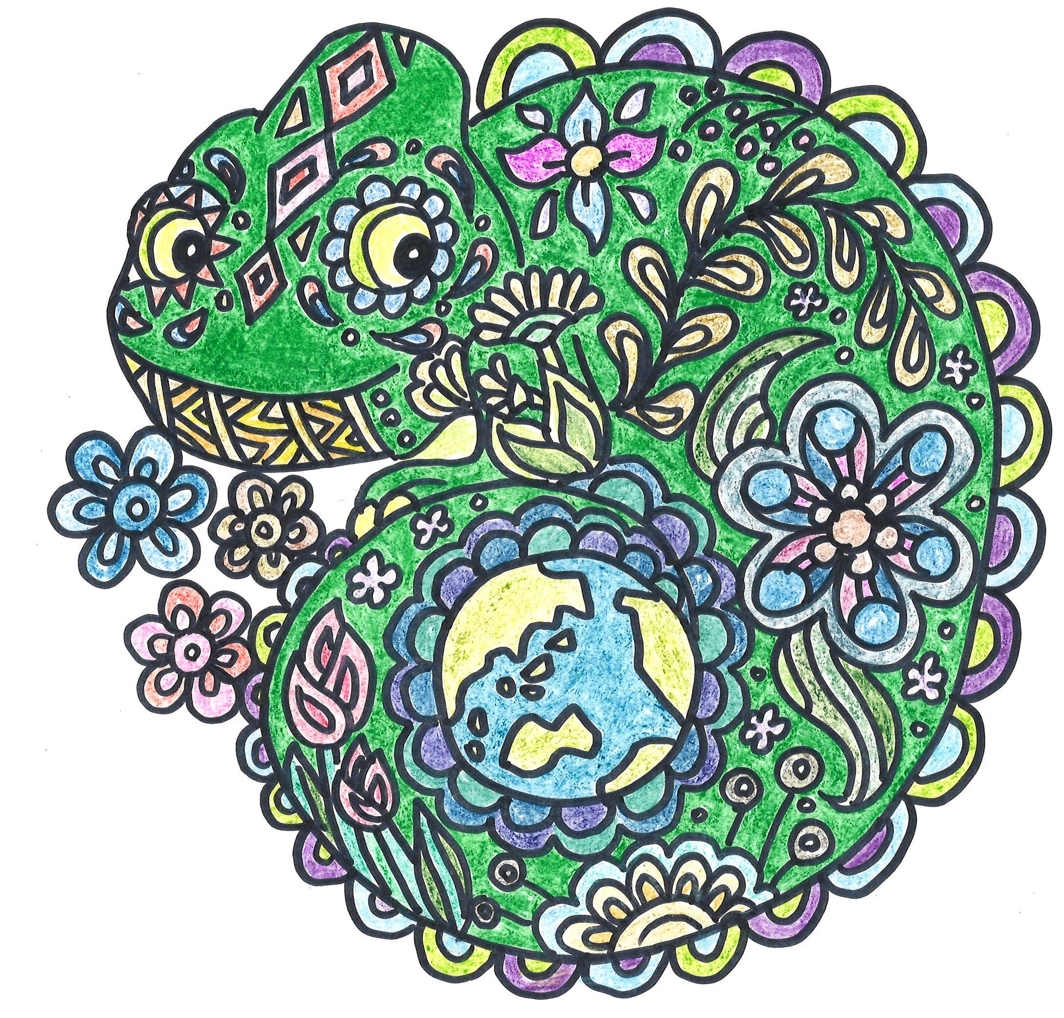子どもの部の作品は、カラフルな色使い、カメレオンの尻尾が地球を守っているデザイン性に魅力を感じました。大人の部は絵が非常に上手。情景から自然の音が聞こえてくるようなインパクトがある絵です。