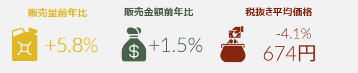 ・リットルあたりの税抜き平均価格は全体で前年同期比4.1%減の674円。店頭販売は同4.6%減の667円、