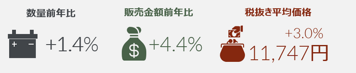 ・税抜き平均価格は全体で前年同期比3.0%増の11,747円。店頭販売は同2.7%増の12,996円、