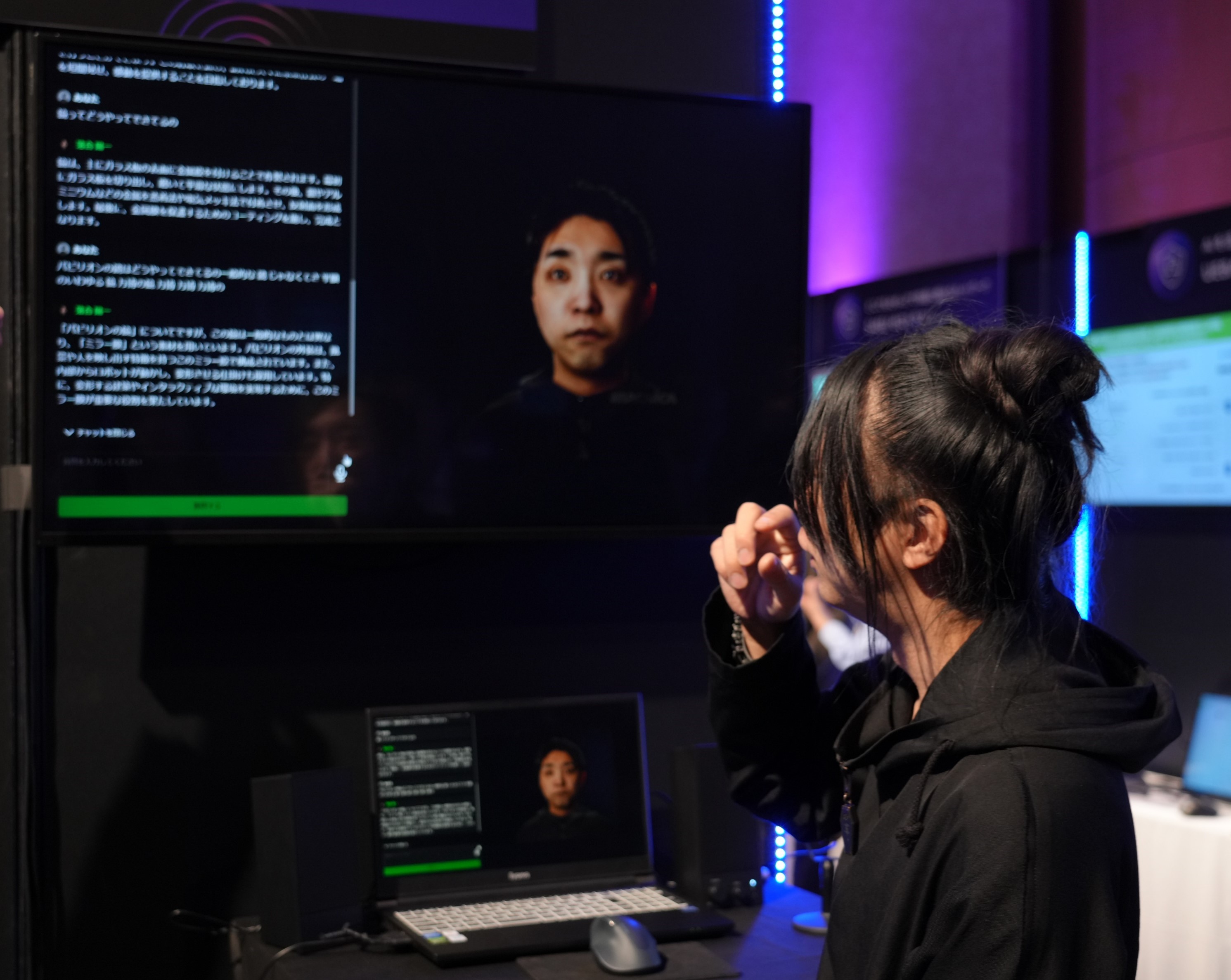 *:3Dスキャン装置は、スマートフォンのアプリを利用して、1台で周囲360度から撮影すると、数分で立体画像を作成できるものです。大規模言語モデルや最先端AI技術を活用したデジタルアバター型ID基盤「Mirrored Body®」によって、口元が動き、自然な受け答えの会話ができることを目指しています。