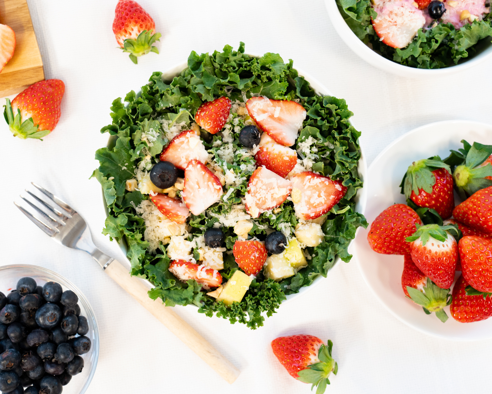 サラダはいちご・ブルーベリー・青りんごなどの瑞々しいフルーツを贅沢に組み合わせ、ほんのり苦味のあるケール、ナッツ、こだわってセレクトしたパルミジャーノ レッジャーノのコクを加えることで、甘味・酸味・苦味を絶妙に調和させました。しっかり満足感がありながらも、軽やかでフルーティーな味わいをお楽しみいただけます。