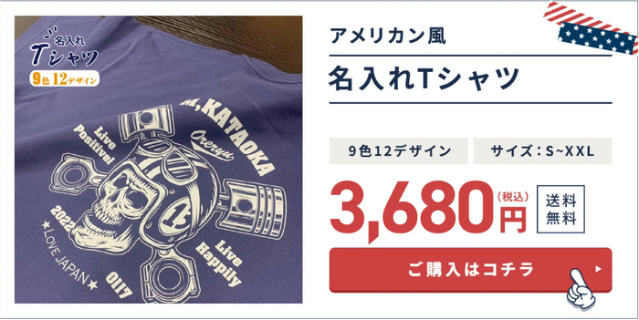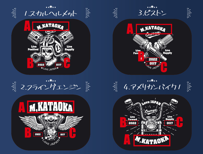アメリカンテイストなデザインが魅力のこのシリーズは、選べる12種類のデザインが揃っています。ピストンやスカル、エンジンといったモチーフが取り入れられたデザインは、ロックンロールの精神を表現しており、名前や記念日を入れてカスタマイズできるので、自分だけのオリジナルTシャツを作ることができます。これらのTシャツは、高品質な素材を使用し、快適な着心地と耐久性を兼ね備えており、長く愛用していただけます。