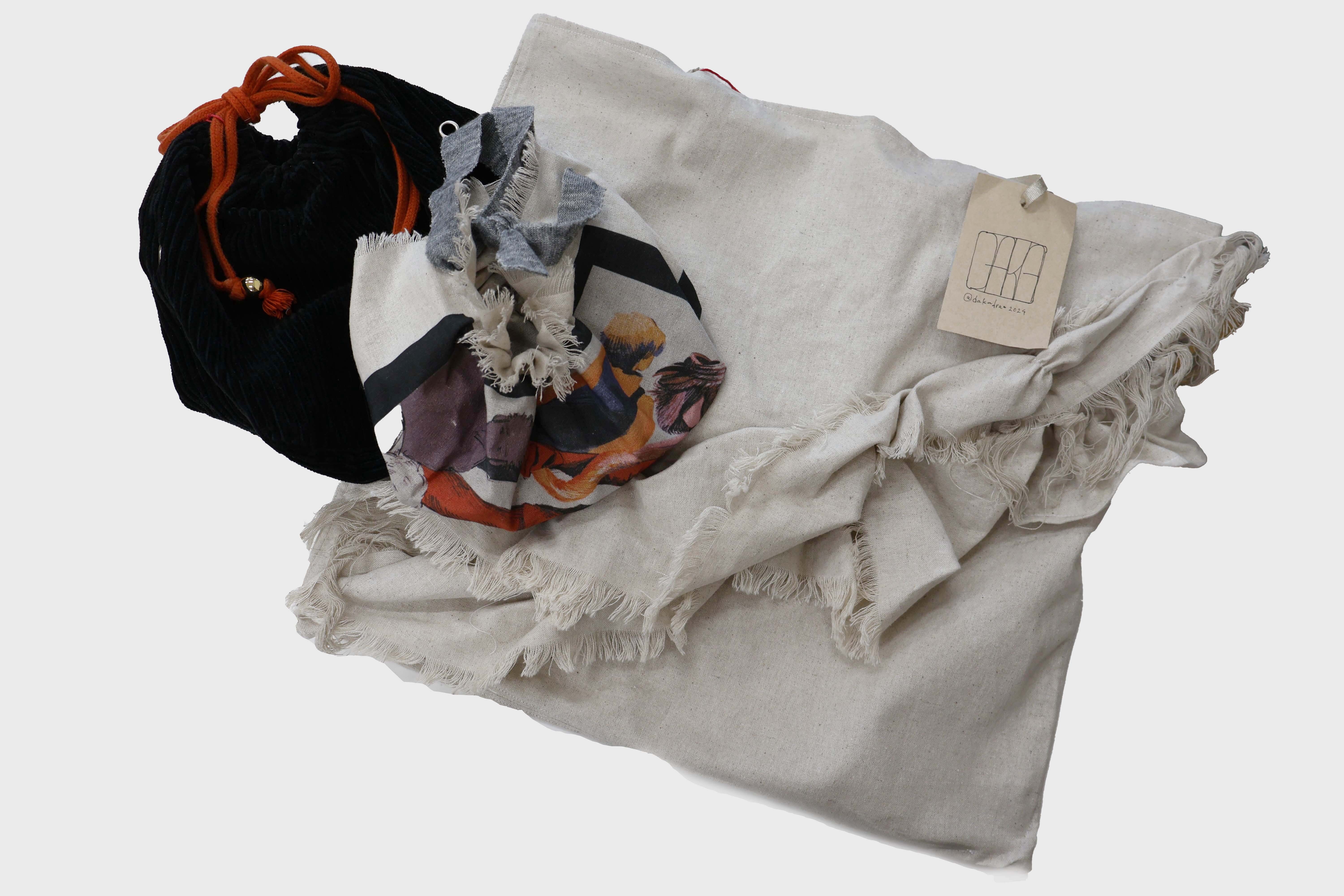 商品の品質を保持するための販売期間を過ぎた衣類や雑貨、布の端切れなどといった、これまで廃棄されてきた物を素材として利用し成安造形大学の学生が作品を制作しました。端切れを縫い合わせて作ったポーチや、ボタンや糸でデコレーションされたネクタイなど多種多様な作品が揃います。