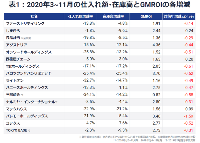 表1の左2列で、2020年3~11月における期中仕入れ額が前年同期と比べどれくらい増減したかと、2020年11月末時点の在庫金額が前年同期と比較してどの程度増減したかをまとめている(売上高順)。