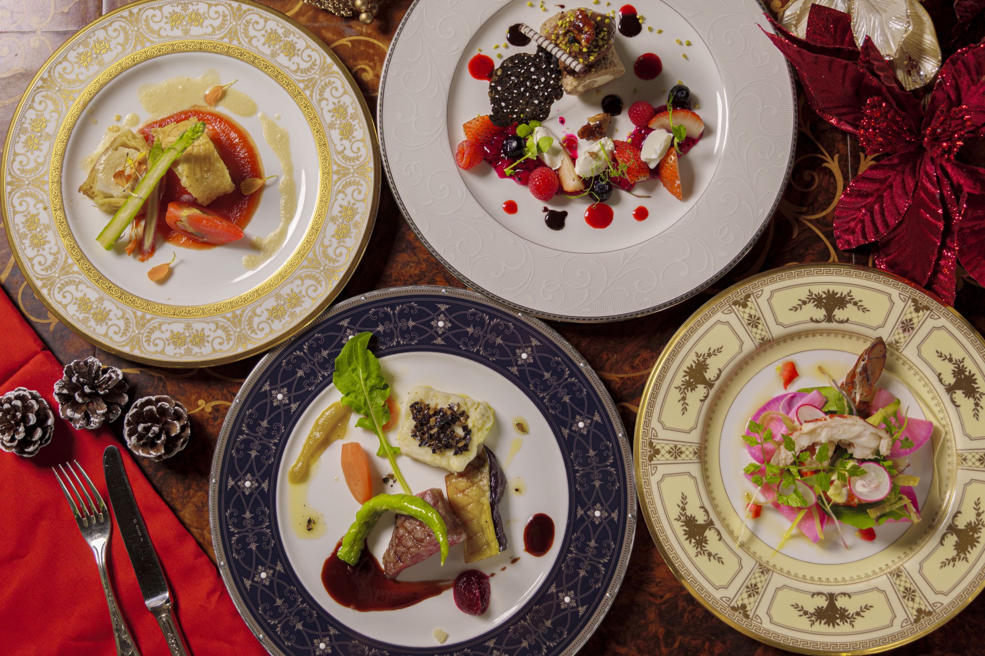 仔鴨のロース肉のロティ 冬野菜の彩り、舌平目のベニエ 冬苺のサラダ 白バルサミコの香り 海の舎オニオングラタンスープ、淡路鯛と蕪のロースト ソースショロン淡路牛のパイ包み焼き フォアグラと芋トリュフ風味、ベリーのカプレーゼとチョコレートのノエル仕立て
