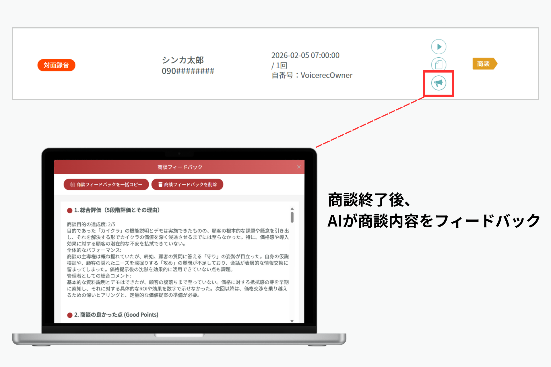 対面商談の録音終了後、生成AIが内容を解析し、具体的なアドバイスや振り返りポイントを提示します。上司が同席せずとも、担当者は客観的なフィードバックを得られるため、セルフコーチングが促進され、組織全体の営業品質の底上げに寄与します。