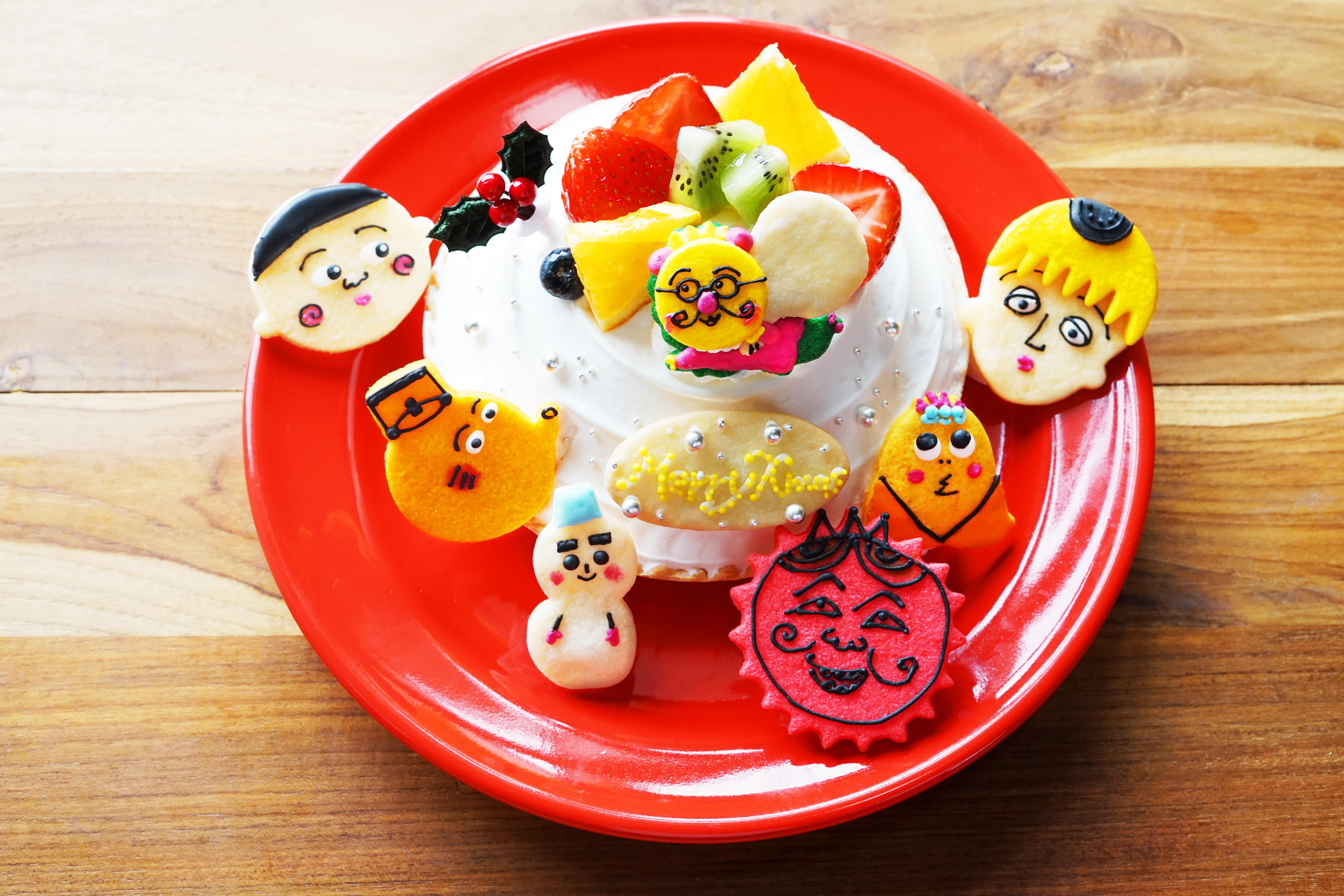サンタのコジコジ、次郎、やかんくん、ゲラン、コロ助、ハレハレくん、ジョニーのアイシングクッキー付きフルーツショートタルト。
