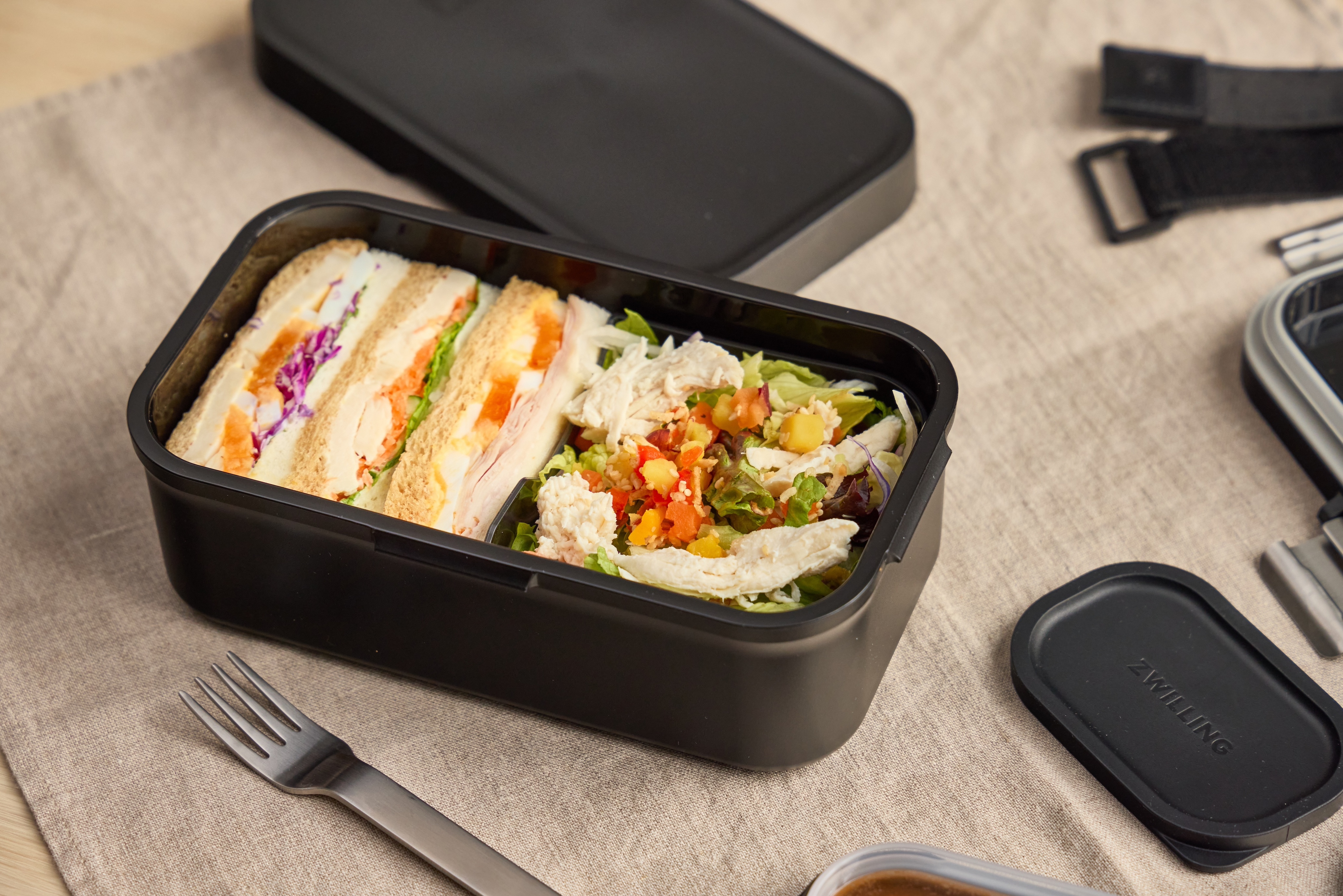 今回のランチボックスはカトラリーセット付き。色はブラックで、より便利でランチボックスらしい形となっています。800mlのたっぷり容量で、男性のランチとしても満足できるサイズです。