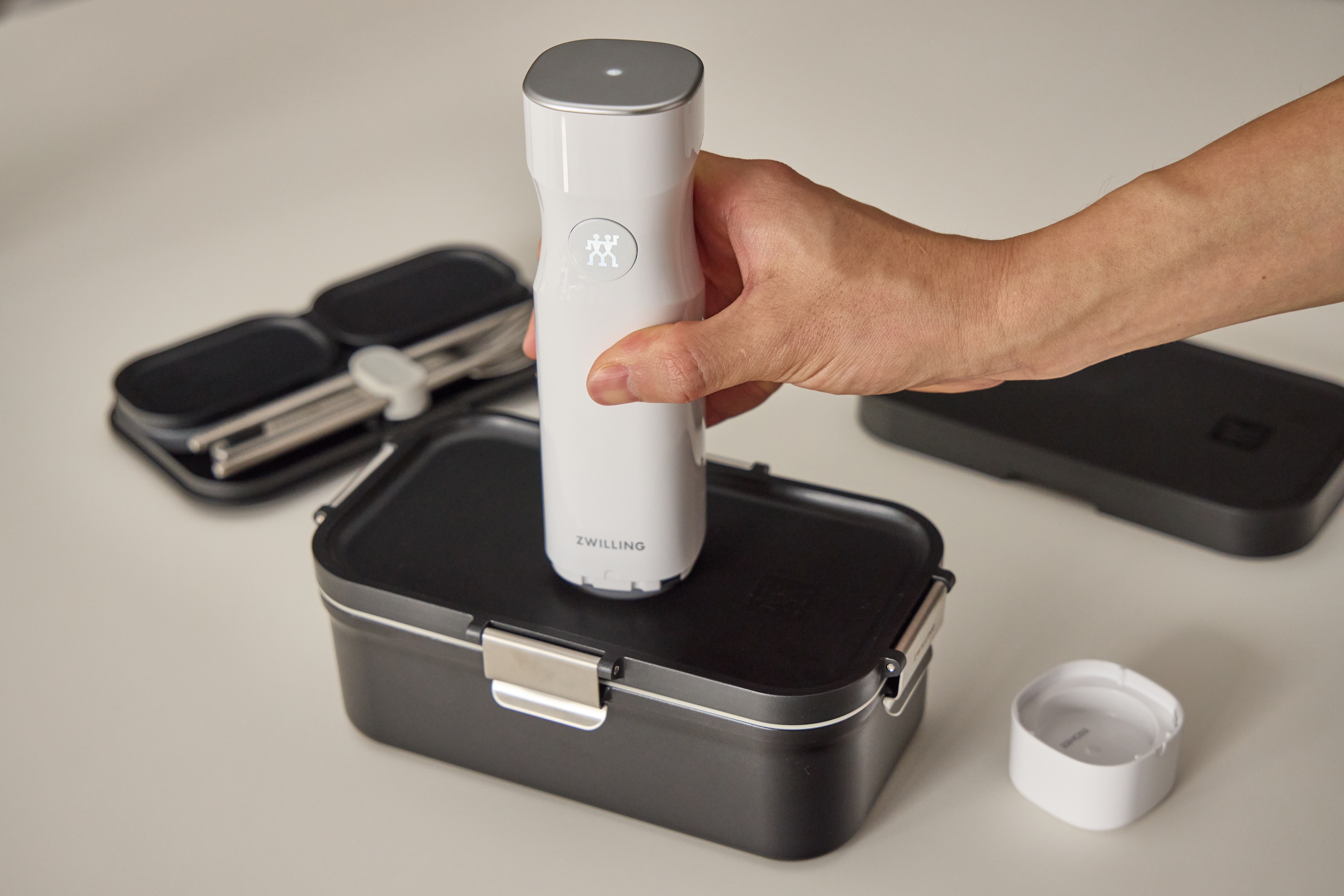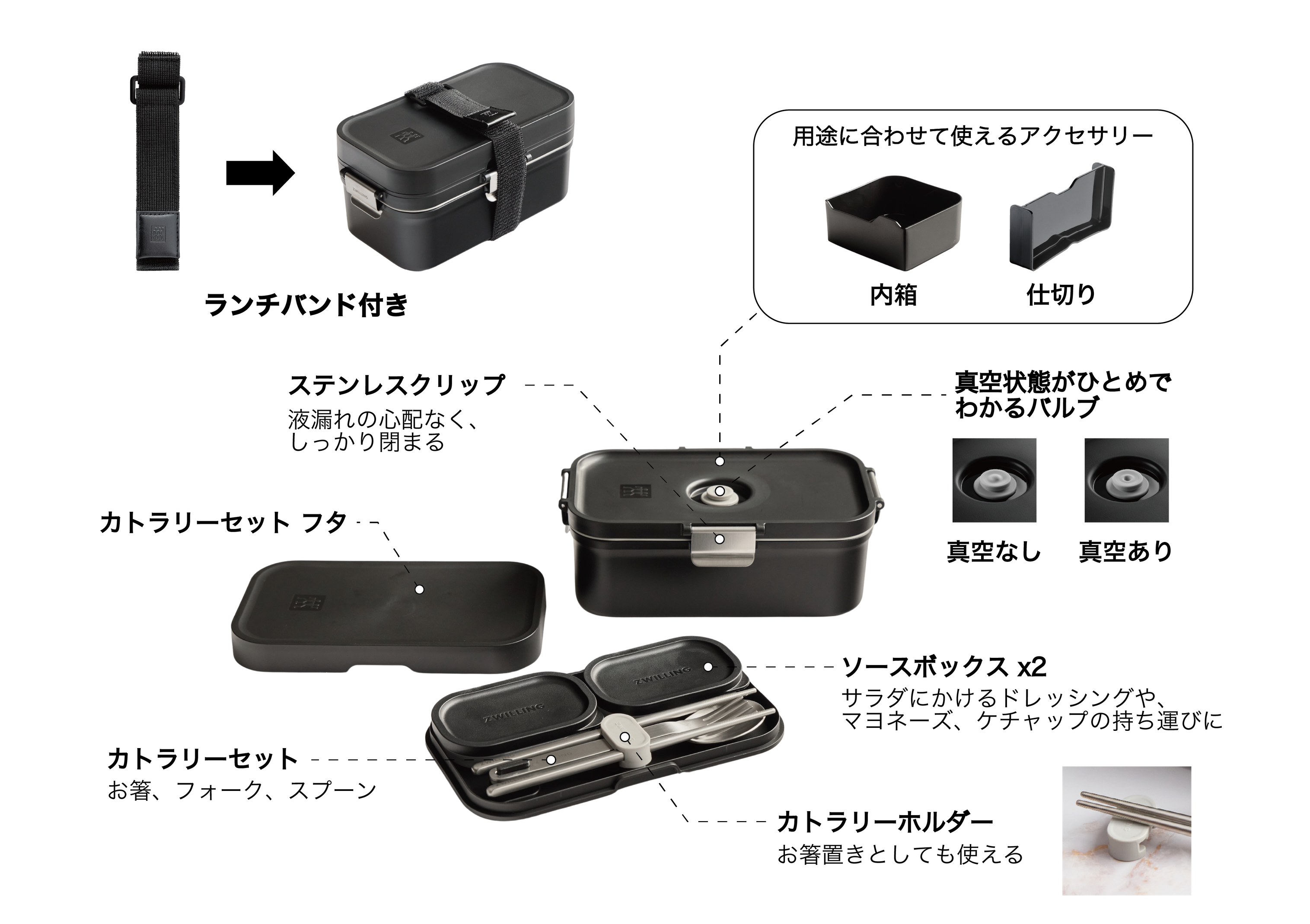 ソースボックスも付属しているため、サラダにかけるドレッシングなどが他の食材にかかる心配もありません。新しい真空保存ランチボックスで、フレッシュなランチをお楽しみください。